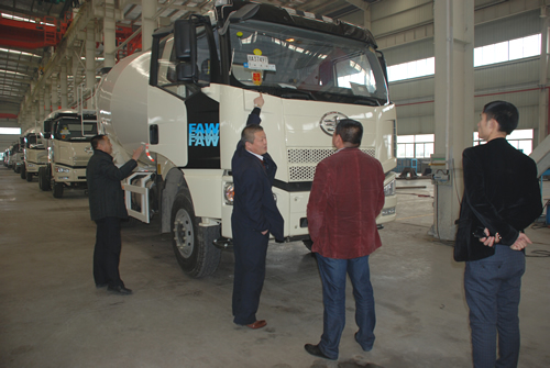 (上圖為客戶現(xiàn)場(chǎng)參觀考察攪拌車生產(chǎn)過程)